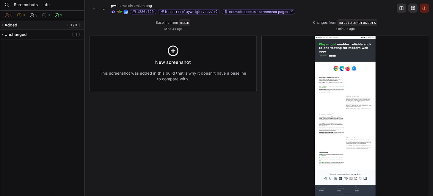 You can click on “Inspect” or “Review” from the comment in the pull request. You will notice that 3 screenshots were added for our new test. For our existing test, the screenshot is unchanged. Since we didn’t pass a unique name `argosScreenshot(page, 'homepage')`, the screenshot was overridden and no new screenshots were added.